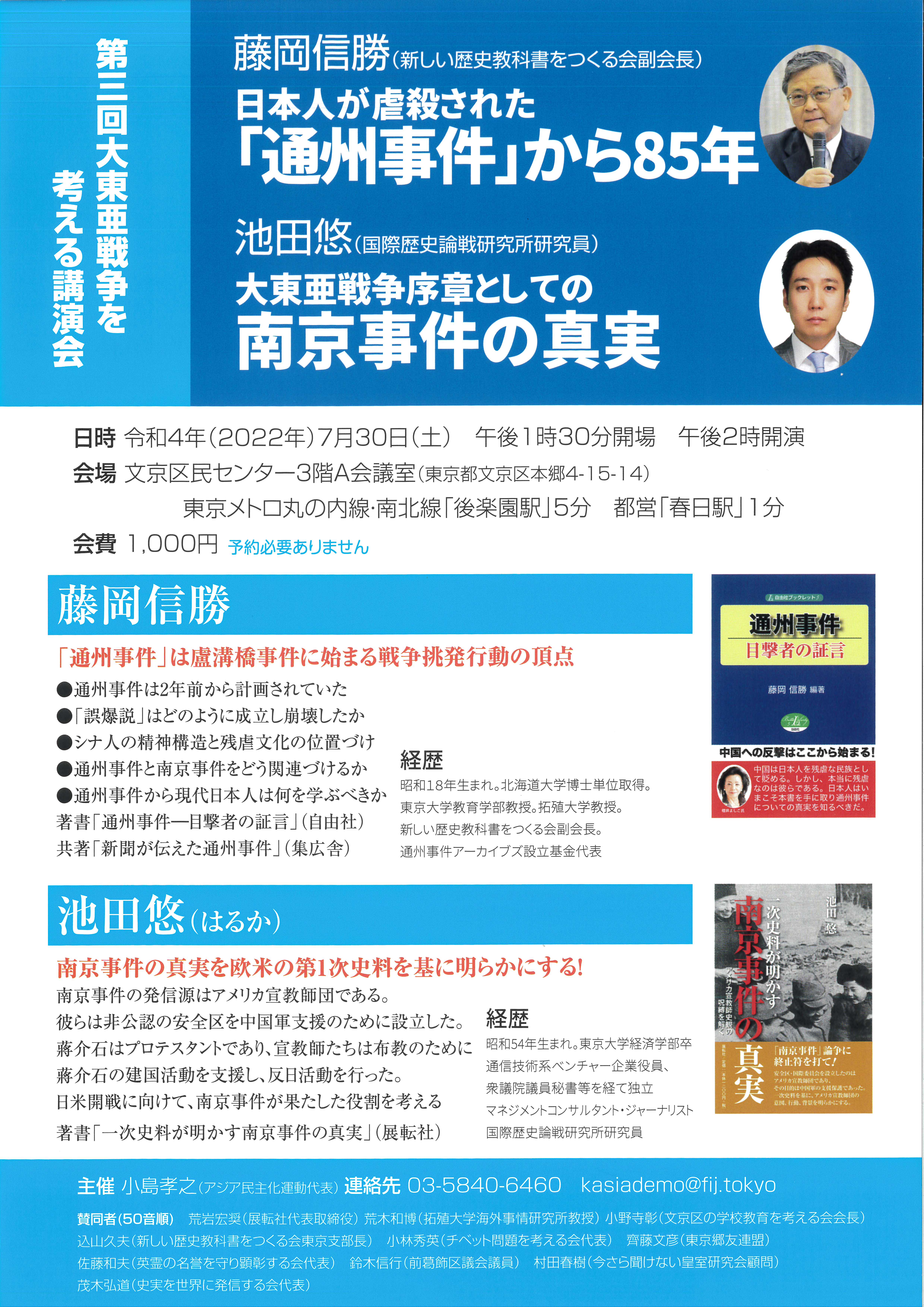 当会では、「歴史戦」の重要な取り組みの一つとして、虚構の「南京事件」を否定する諸々の活動と併せて、本当にあった「通州事件」の存在を世の中に広める活動を展開してまいりました。文科省の検定を通り、平成24年度より使用されている中学校用『新しい歴史教科書』(自由社)にも、「通州事件」についての記述があります。
